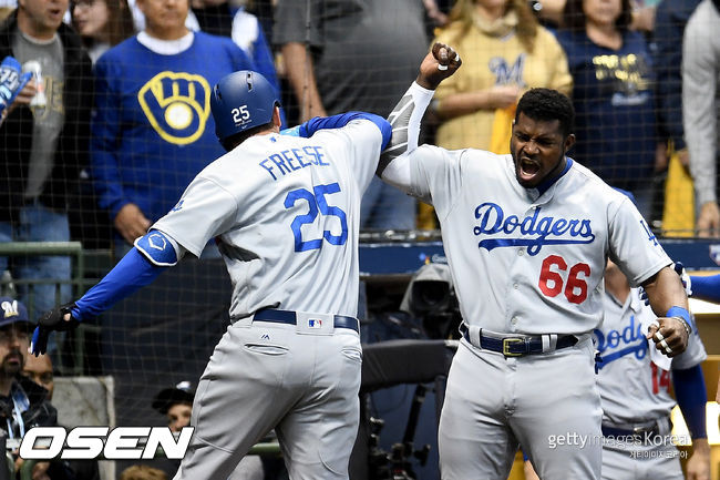 해결사는 푸이그였다. 6회초 다저스는 저스틴 터너와 맥스 먼시의 연속 안타로 기회를 잡았다. 2사에서 등장한 푸이그는 우중간 담장을 크게 넘기는 대형 스리런 홈런을 터트렸다. 순간 4만 4097명이 운집한 밀러파크가 정적에 휩싸였다. 다저스는 마치 승리가 확정된 듯 기뻐했다.