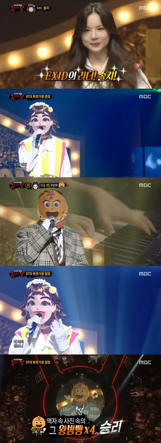 87대 복면가왕 결정전에 오른 동막골소녀는 6연승에 도전하기 위해 정준일의 '고백'을 선곡했다. 감성 가득한 그의 노래에 관객들은 눈물을 흘렸다. 연예인 판정단은 동막골소녀를 향해 "오늘 무대가 최고 좋았다"며 극찬했다. 팽팽한 대결 끝에 87대 복면가왕으로 오른 이는 바로 왕밤빵이었다. 새로운 가왕의 탄생에 관객은 환호했다. 정체를 드러낸 동막골소녀는 바로 EXID 솔지였다./ yjh0304@osen.co.kr