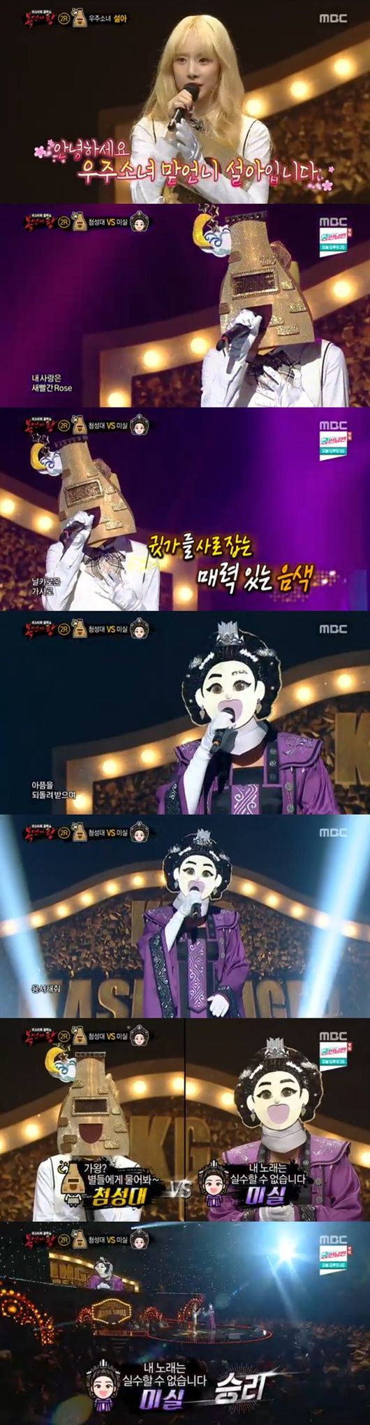 이날 2라운드 첫 대결에는 첨성대와 미실이 올랐다. 첨성대는 이하이의 '로즈'를 열창했고, 미실은 박미경의 '기억 속의 먼 그대'를 불렀다. 2라운드 첫 번째 대결의 승자는 미실이었다. 가면을 벗은 첨성대는 바로 우주소녀의 설아였다.