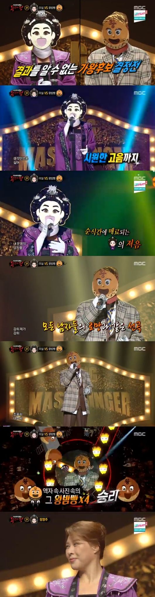 3라운드에서 마주한 미실과 왕밤빵은 각각 버블시스터즈의 '하늘에서 남자들이 비처럼 내려와', 임재범의 '고해'를 불렀다. 가왕결정전에 진출한 사람은 바로 왕밤빵이었다. 가면을 벗은 미실은 뮤지컬 배우 정영주였다.
