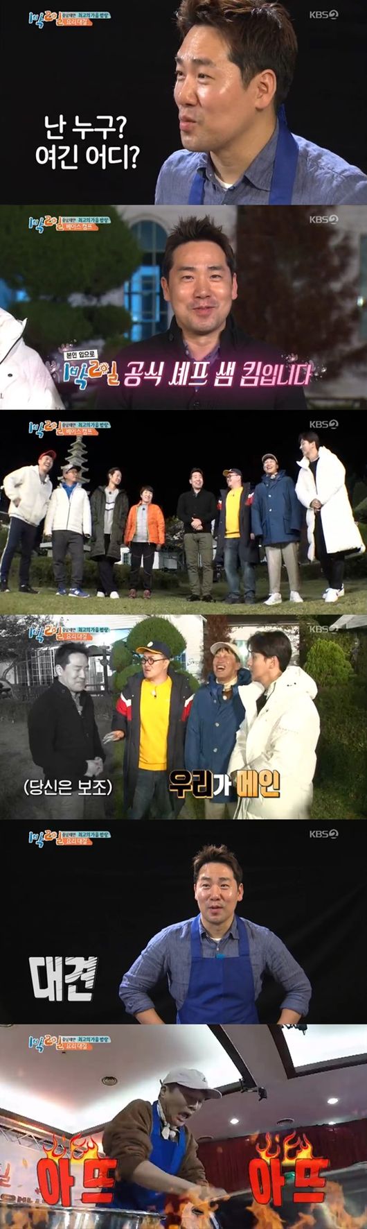 샘킴은 "'1박2일' 공식 셰프 샘킴"이라며 자신을 소개했고, "혹시라도 지면 자고 가야하니까"라며 준비된 '1박2일' 공식 셰프임을 드러냈다. 수석셰프라고 하지만, 양식이 주 전공인 샘킴은 한식 메뉴에 긴장했다. 샘킴은 내 주종목도 아니라 긴장을 많이 했다. 질 수도 있을 거 같다는 생각을 하고 왔다"며 진땀을 흘렸다.