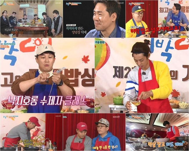 지난 21일(일) 방송된 KBS 2TV ‘해피선데이-1박 2일 시즌3’(연출 유일용, 이하 ‘1박 2일’)는 전라남도 무안과 경남상도 양산으로 떠난 ‘제2회 최고의 가을밥상 요리대결’ 첫 번째 이야기가 펼쳐진 가운데 보는 이들의 침샘을 무한 자극하는 각 팀의 쿡존심 대결이 배꼽 잡는 웃음을 선사했다. 더욱이 여섯 멤버들이 도전하게 된 음식은 ‘1박 2일’ 시즌3 동안 각 멤버들의 입맛을 강타했던 것은 물론 시청자들의 마음에 깊이 각인된 음식, 냄새부터 반칙을 유발하는 돼지갈비와 더위 먹은 소를 벌떡 일어나게 만든다는 낙지 물회와 낙지 호롱이였던 것.