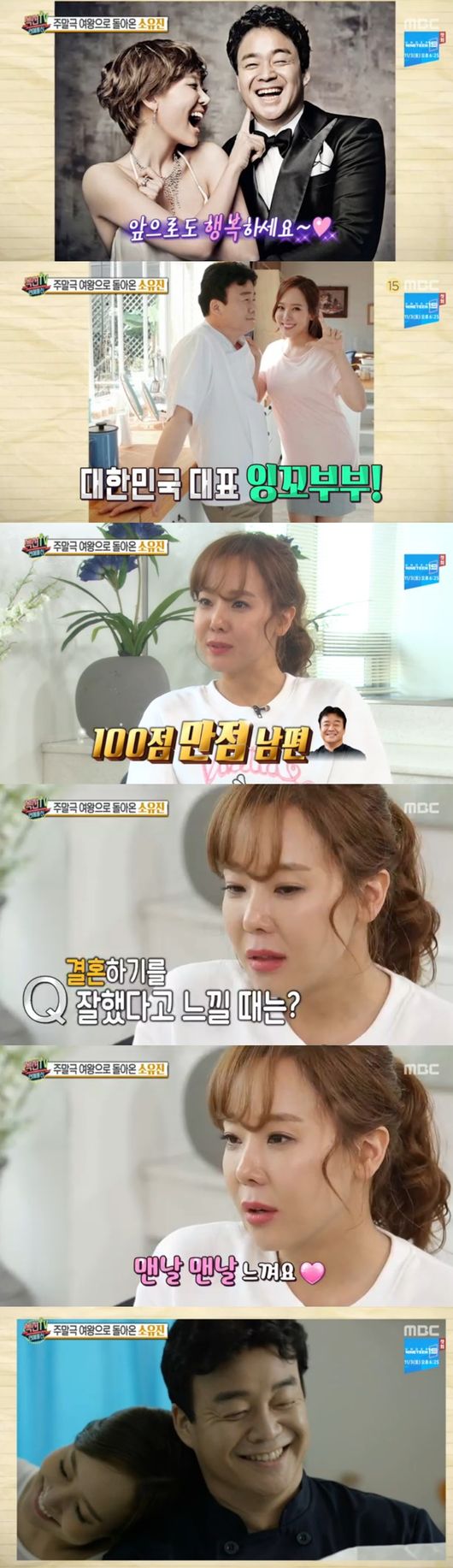 소유진은 "딸바보 백종원"이라면서 "딸에게 자리 뺏겼다 질투날 정도"라고 했다. 이어 남편이 몇점짜리인지 묻자 "백만점 남편, 정말 행복하다"며 남편에 대한 애정을 보였다.