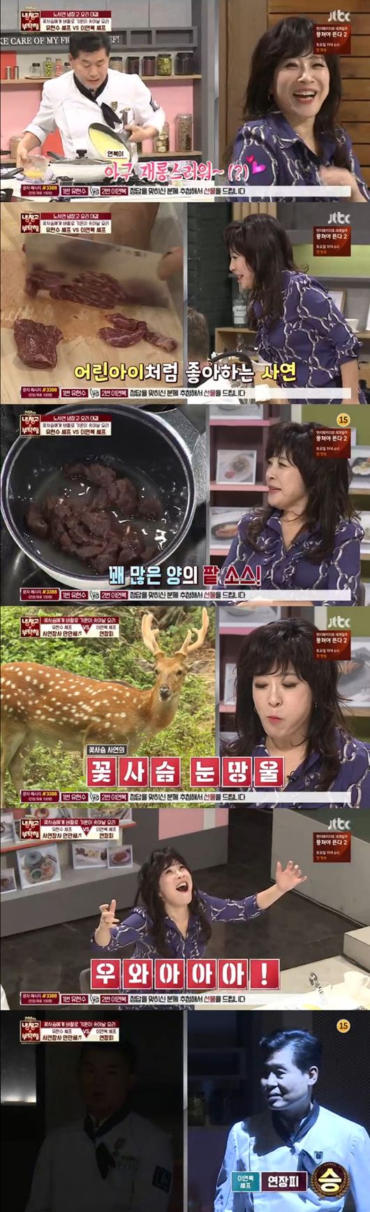 두 번째 노사연 냉장고 요리대결에는 유현수와 이연복 셰프가 나섰다. 노사연은 이연복 셰프가 자신보다 두 살 어리다고 말하며 "연복아 수고해"라고 말해 모두를 놀라게 했다. 두 셰프의 대결 승자는 이연복 셰프였다. 노사연은 "유현수 셰프도 멋있었는데 이연복 셰프가 지금까지 먹어봤던 최고의 양장피를 만들어줬다"고 말했다./ yjh0304@osen.co.kr