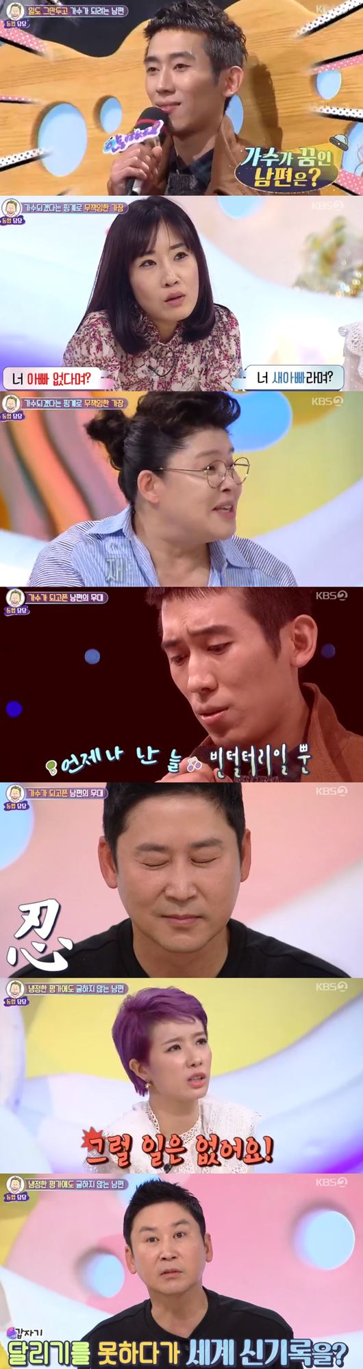 남편이 출연했다. 혼자 연습하면 되지 왜 퇴근하고 아내한테 계속 부르냐고 질문이 시작됐다. 남편은 "아내한테는 인정 받아야한다"고 말했다. 아내는 "노래를 들으면 감동이 오고 기분이 좋아지거나 해야하는데 그런 게 전혀 없다"고 털어놨다.