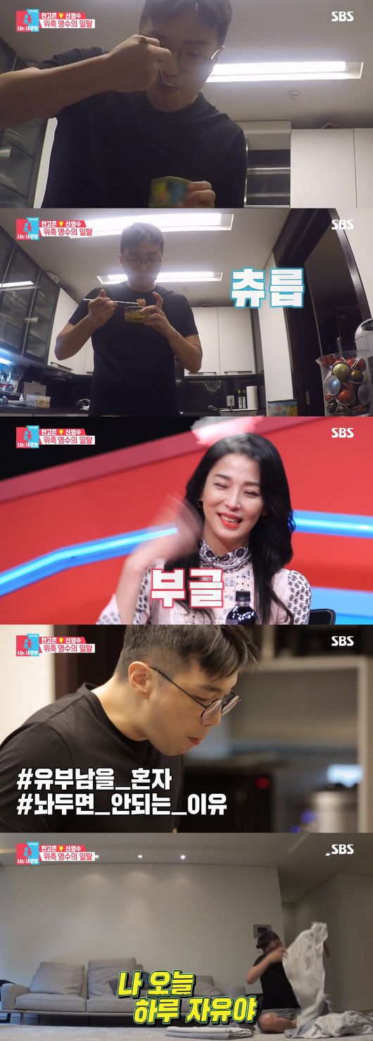 그런 그가 한고은이 없자 의외의 모습을 보였다. 한고은이 화보 촬영을 하러 갔는데, 스케줄 가기 전에 한고은은 남편을 위해 갈비찜과 김치찌개 등을 준비했다. 바쁠 때도 남편 끼니를 꼭 챙겨주려는 아내의 마음으로 준비했는데 신영수는 이를 먹지 않았다.