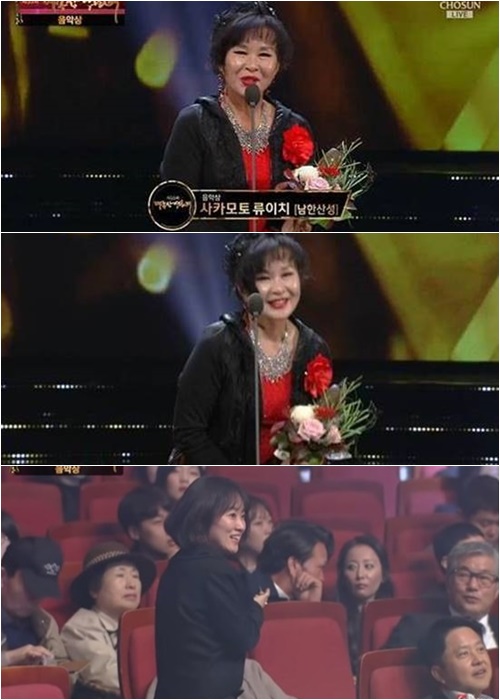 무대에 선 한사랑은 "(류이치 사카모토가)너무 바쁘셔서 제가 대신 나왔다. 저는 가수 겸 배우 한사랑이다. 축하 드린다"라고 류이치 사카모토를 대신해 인사를 건넸다. 그러나 사카모토와의 관계에 대해서는 전혀 언급이 없었다.