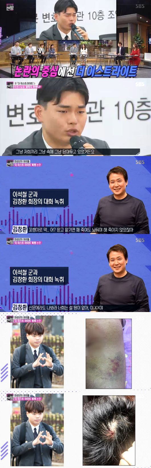 더이스트라이트가 소속된 대표는 김건모, 신승훈 등 발굴한 유명 프로듀스 김창환이다. 폭행을 목격하고도 제지하지 않고 살살하라고 방관까지 했다고.김창환 소속사를 찾아가 물었으나, 소속사 관계자는 "다른말씀 드릴게 없다, 속상해한다"고 전했다.