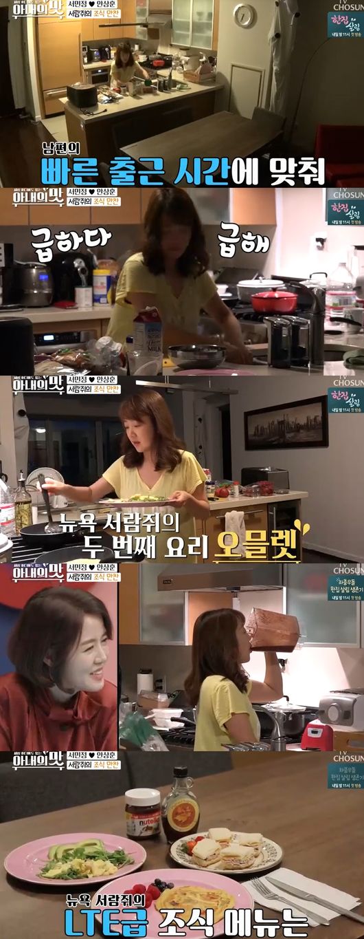서민정은 오전 6시 반에 맞춰 남편 식사를 챙겼다. 아침용 팬 케이크와 계란 후라이에 이어, 스크램블과 오믈렛을 준비했다. 화룡정점으로 과일주스와 샌드위치까지 챙겼다. 요리를 마친 후, 딸도 일어났다.