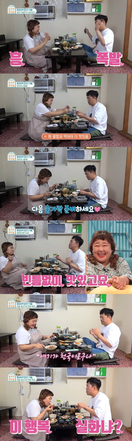 홍윤화는 “오빠가 잘 먹어서 너무 좋다”고 말했다. 평소와 달리 강한 식욕을 드러낸 김민기는 “너무 행복하다”면서 젓가락질을 멈추지 못했다.