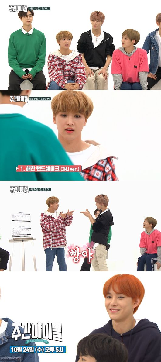 이어서 멤버 해찬은 ‘나 홀로 SM 랜덤 플레이 댄스’에 도전했다. 해찬의 댄스와 함께 팀 막내의 SM 역대 히트곡 총망라한 랜덤 플레이 댄스를 보는 형들의 꿀 떨어지는 스윗한 눈빛 또한 빼놓을 수 없는 감상 포인트. 또한, 해찬과 멤버들의 각양각색 ‘핸드쉐이크’ 인사법이 ‘주간아이돌’에서 최초로 풀 버전으로 공개된다. 모든 멤버와 전부 다른 핸드쉐이크를 NG 없이 소화해내는 해찬의 섬세함 덕분에 현장을 훈훈하게 만들었다.