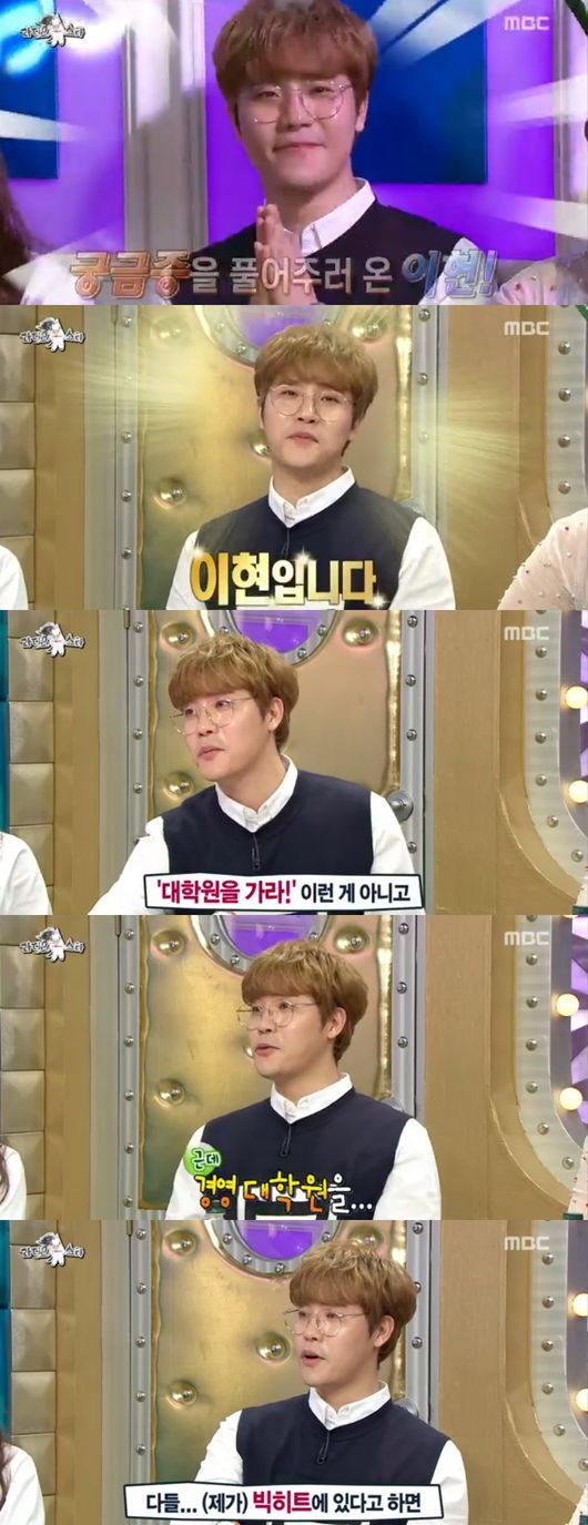 이현은 "빅히트의 정통후계자"라고 소개, 대표 방시혁이 경영대학원 보내줬다는 후문을 묻자, 이현은 "관뒀다"면서 "한 학기 다녔는데 너무 안 맞더라"고 했다. 이어 방시혁 대표가 "너와 회사를 위해서 좋은 기회가 될 것"이라며 보내줬다고 해 눈길을 끈 것. 이혀는 "빅히트 소속이라고 하면, 네가 왜 있냐고 묻더라"면서 "방탄소년단이 있는 회사랑 처음 계약자는 나다, 빅히트 1호 개국공신"이라고 말 해 웃음을 안겼다.