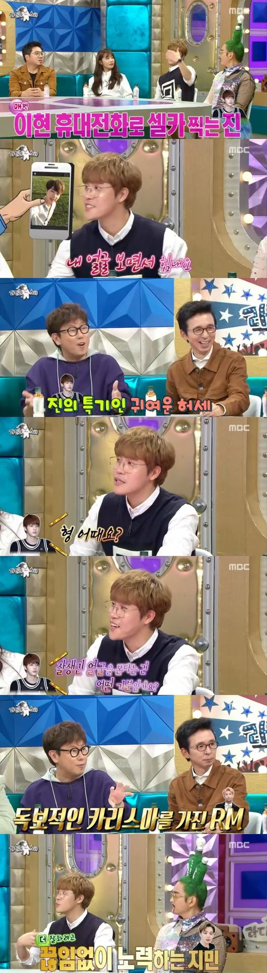 이현에게 같은 소속사인 BTS 얘기가 빠질 수 없었다. 친한멤버인 지민과 진을 언급, 이현은 "지민은 노래하면 아쉬움에 자책하는 스타일"이라며 끊음없이 노력하는 노랙하라고 했다. 이어 진에 대해서는 "진이 놀리기가 영광스럽다"면서 "함께 숨쉬어주는 것만으로도 영광"이라고 해 웃음을 안겼다.
