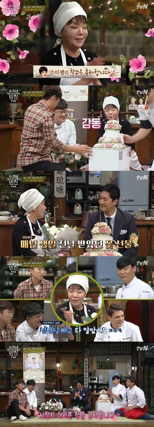 하지만 이날의 하이라이트는 김수미를 위해 셰프들이 준비한 깜짝 칠순 파티. 특히 김수미와 각별한 사이인 신현준도 김수미를 축하하기 위해 ‘수미네 반찬’을 찾아 반가움을 더했다. 김수미는 생각지도 못한 깜짝 파티와 선물에 “말도 안했는데 어떻게 준비했냐”며 크게 기뻐했다.