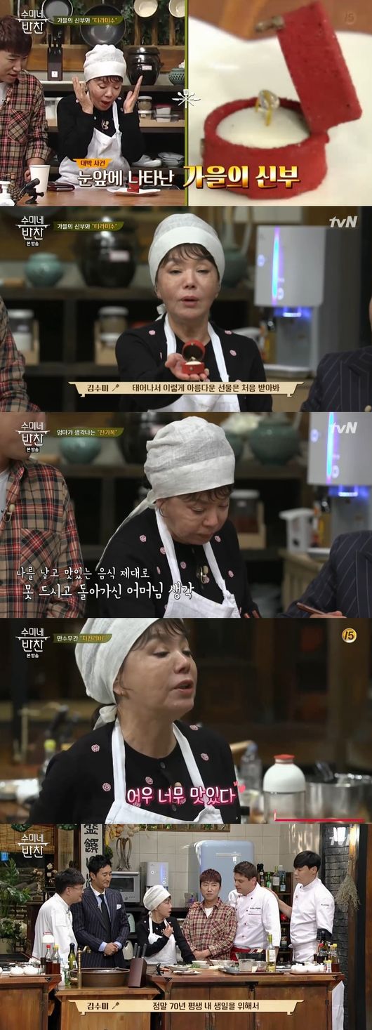 이날 셰프들은 김수미의 칠순을 기념해 선생님께 해드리고 싶은 요리라는 주제로 각자 자신의 실력을 뽐냈다. 최현석은 ‘수미네 반찬’ 최초로 디저트를 만들겠다며 ‘티라미수미’라는 이름의 달콤한 디저트로 시선을 사로잡았다. 티라미수와 함께 반지케이스를 연상케 하는 타르트를 맛본 김수미는 “너무 맛있다 설명할 수가 없다. 태어나서 이렇게 아름다운 선물은 처음 받아본다”고 감탄했다.