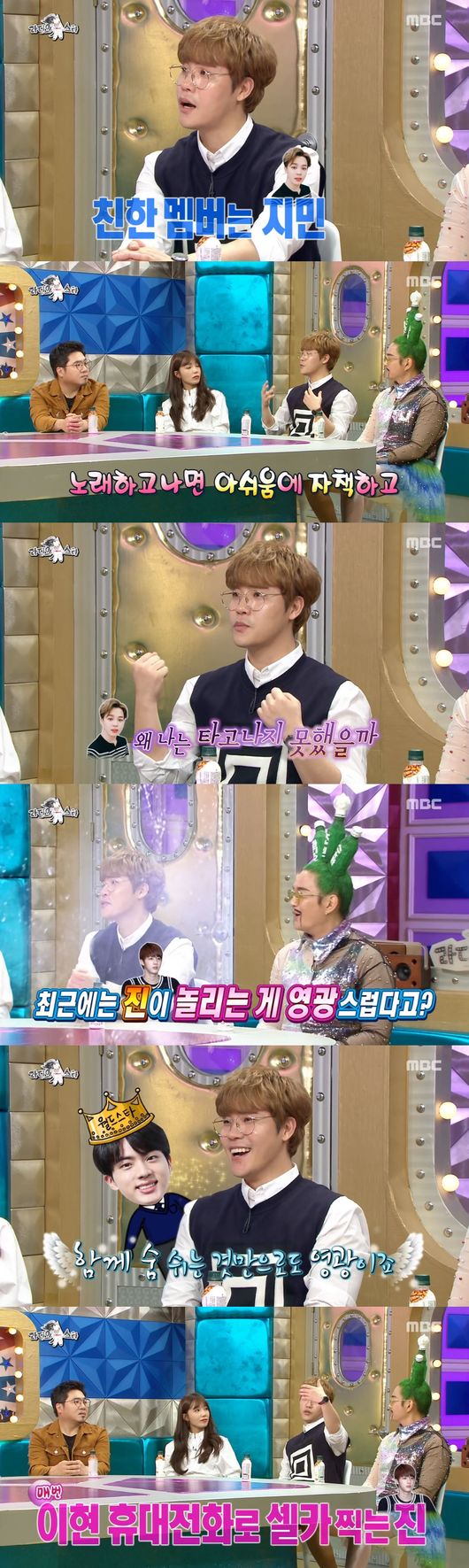특히 진과는 두터운 친분을 자랑하고 있다. 이현은 "진이 같은 경우는 제 핸드폰을 빼앗아서 자기 사진을 찍는다. '보면서 힘내요~'라고 한다. 녹음을 하러 왔는데 진 혼자 오더니 '형 어때요? 월드스타랑 녹음하는 기분이?'라고 말한다. 오히려 편하다. 감사하다. '형 어때요? 잘생긴 얼굴을 본다는 건 어떤 기분이에요?'라고 묻는데 기분 안 나쁘게 잘한다"며 진의 싹싹함을 칭찬했다. MC들 역시 "그렇게 대해주는 게 오히려 더 편하다"며 동감했다.