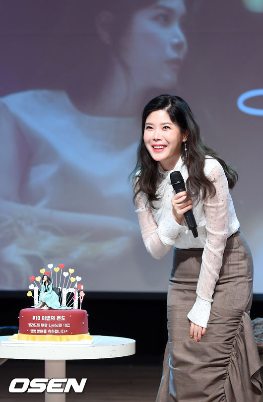 뿐만 아니라 이날 쇼케이스에는 남편 이수가 깜짝 이벤트를 준비했다. 직접 등장하진 않았지만 정규 10집 발매를 축하하는 케이크가 무대 위에 올라온 것이다.