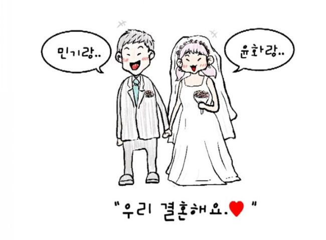 김민기는 지난 24일 자신의 블로그에 "드디어 드디어 결혼 합니당~밍키월드 보시면서 둘이 언제 결혼하나 궁금 하셨죠 ㅎ 드디어 9년만에 연애를 끝내고 결혼합니다"라며 "청첩장 그림을 제가 직접 그렸어요. 이건 여기서 처음 말씀드리고 싶어서요"라며 청첩장 그림을 첨부했다.