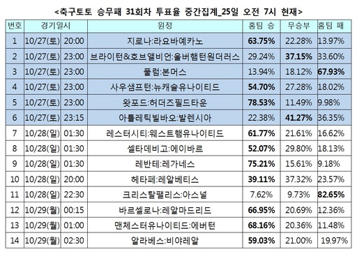 EPL 및 라리가 14경기 대상 축구토토 승무패 31회차 투표율 중간집계 결과