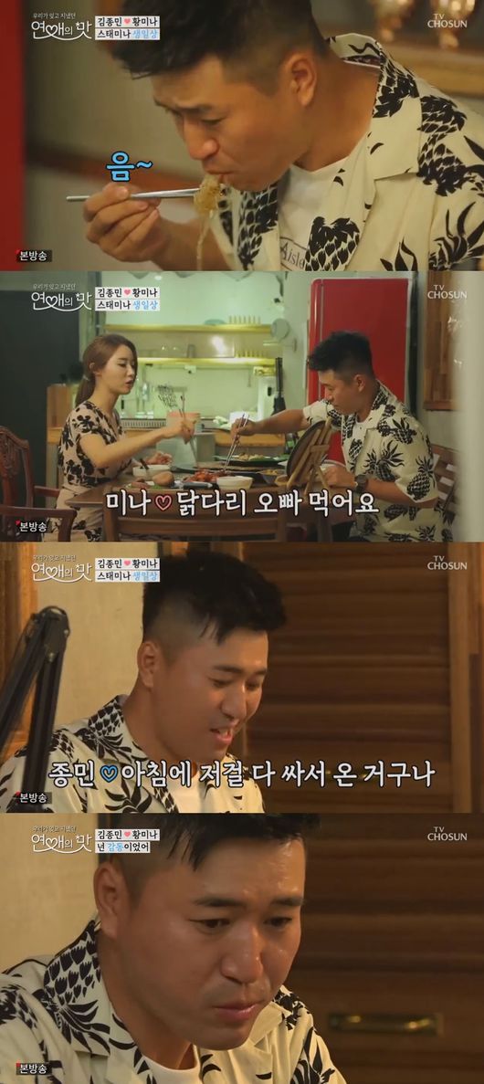 김종민은 25일 오후 방송된 TV조선 '연애의맛'에서 황미나가 차려준 생일상을 받았다. 황미나는 김종민을 위해서 4시간에 걸쳐 닭볶음탕, 돔미역국, 바다장어, 잡채 등을 준비했다.