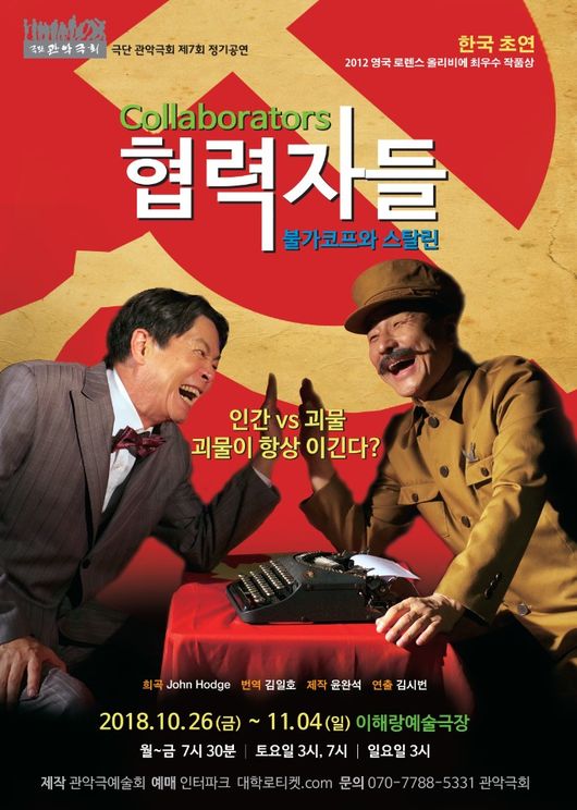 ‘협력자들:불가코프와 스탈린’(원제 Collaborators)은 영국의 시나리오 작가이자 극작가인 존 홋지(John Hodge)의 작품으로 2012년 영국 최고 권위의 희곡상인 로렌스 올리비에상(Olivier Award)’ 수상작이다. 2011년 런던에서의 흥행에 힘입어 2016년부터는 뉴욕과 워싱턴에서도 공연되고 있다. 한국에서는 10월 26일부터 열흘간 이해랑예술극장에서 김시번 연출, 관악극회 공연으로 첫 선을 보인다.