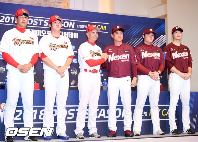 SK와 넥센은 27일 인천SK행복드림구장에서 열리는 1차전을 시작으로 2018 KBO 플레이오프 5전3선승제 승부를 벌인다. 양 팀은 26일 플레이오프 미디어데이를 가졌고, 곧 이어 플레이오프 최종 엔트리 30명을 발표했다.