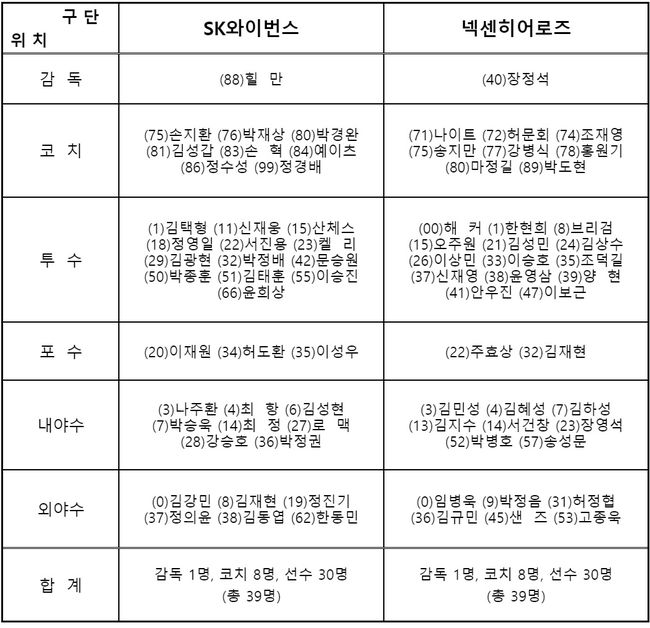 SK는 베테랑 투수 채병용과 박희수가 엔트리에서 빠졌다. SK 왕조 시절을 이끈 멤버들이었지만 플레이오프에는 포함되지 못했다. 투수 인원을 하나 줄여 포수 3명으로 꾸린 게 특징이다.