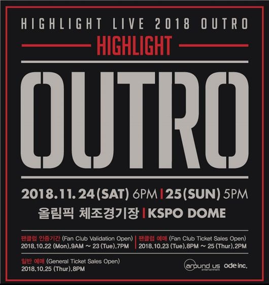 지난 25일 오후 8시 온라인 예매사이트 인터파크에서 하이라이트 연말 콘서트 ’OUTRO’의 티켓 예매가 진행된 가운데, 10분 만에 2회 공연이 전석 매진되면서 콘서트 랭킹 1위를 차지했다.