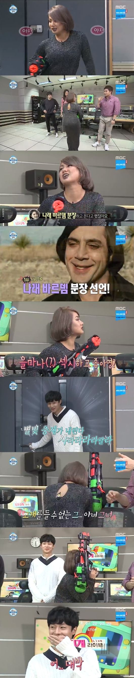 박나래는 마마무 화사가 선물한 드레스와 하비에르 바르뎀을 닮은 분장으로 등장하자마자 웃음을 자아냈다. 손에 가스총 대신 대형 물총을 든 박나래는 볼륨감 넘치는 엉덩이 라인을 자랑했고, 기안84와 전현무는 민망한 표정을 드러냈다.