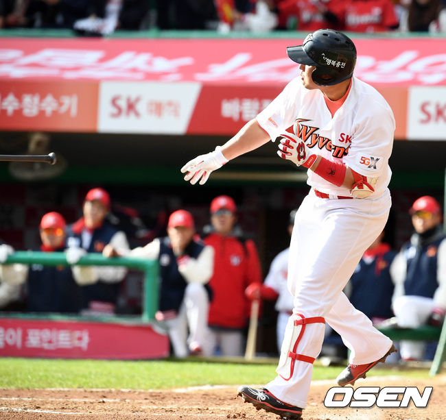 SK 최정이 분노했다. 넥센 제이크 브리검의 몸쪽 위협구에 화가 난 나머지 배트를 집어던졌다.