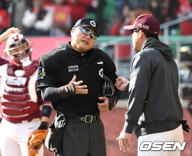하지만 넥센 장정석 감독이 최정의 퇴장 여부를 어필했다. 배트를 던졌으니 퇴장이 아니냐는 주장이었지만 심판이 받아들이지 않았고, 4분간 중단된 경기는 별도의 퇴장 없이 속개됐다. /waw@osen.co.kr