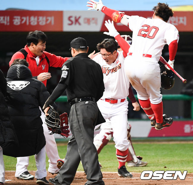 마지막도 홈런으로 끝났다. 8-8로 팽팽한 9회말 1사 1루에서 타석에 들어선 박정권이 중월투런 아치를 그려내 승부를 결정냈다. 이날 양팀에서 나온 홈런은 모두 7개. 18득점 가운데 홈런으로만 15점을 뽑았다. 홈런으로 시작해서 홈런으로 끝난 1차전이었다.