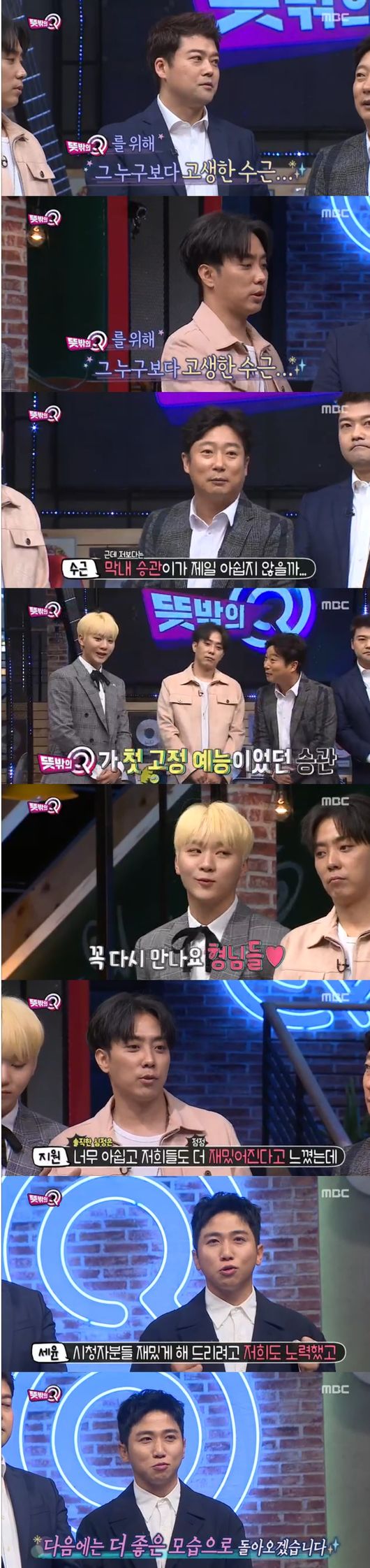 전현무는 "수근이 형 마지막 우승 뜻밖이다, 형 프로다"며 축하했고, 은지원 여기 "제일 고생하고 헌신한 형"이라면서 역시 우승을 축하했다. 이수근은 "너무 아쉽다, 재밌을 때 좋은 프로가 없어졌다"며 역시 아쉬운 마음을 드러냈고,유세윤은 "노력했고 제작진도 최선을 다했다, 더 좋은 모습으로 돌아오겠다"며 소감을 전했다. 전현무는 "농담삼아 디스했지만 애정이 있어 그런 것"이라면서 종방에 대한 아쉬움을 드러냈다.