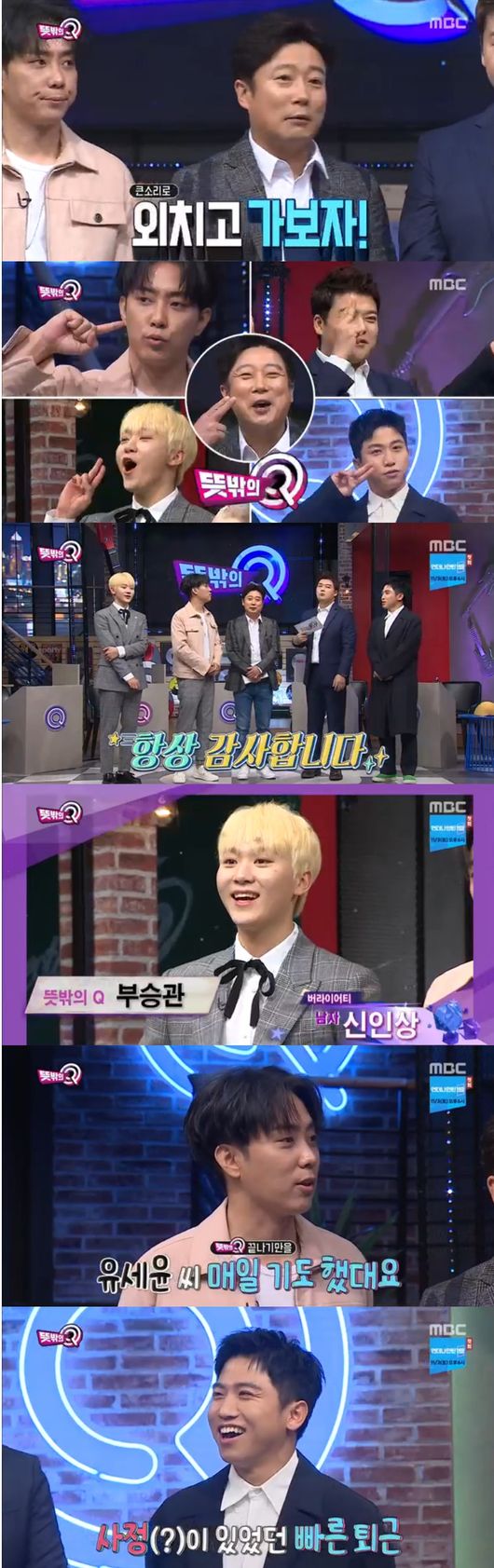 이날 MC들은 '뜻밖의Q'의 종영을 언급, 부승관에겐 신인상을 줘야한다면서 농담으로 시작했다. 부승관은 "올해드라마 고생하고 노력한프로 없다"며 노력상을 언급해 웃음을 안기기도 했다.