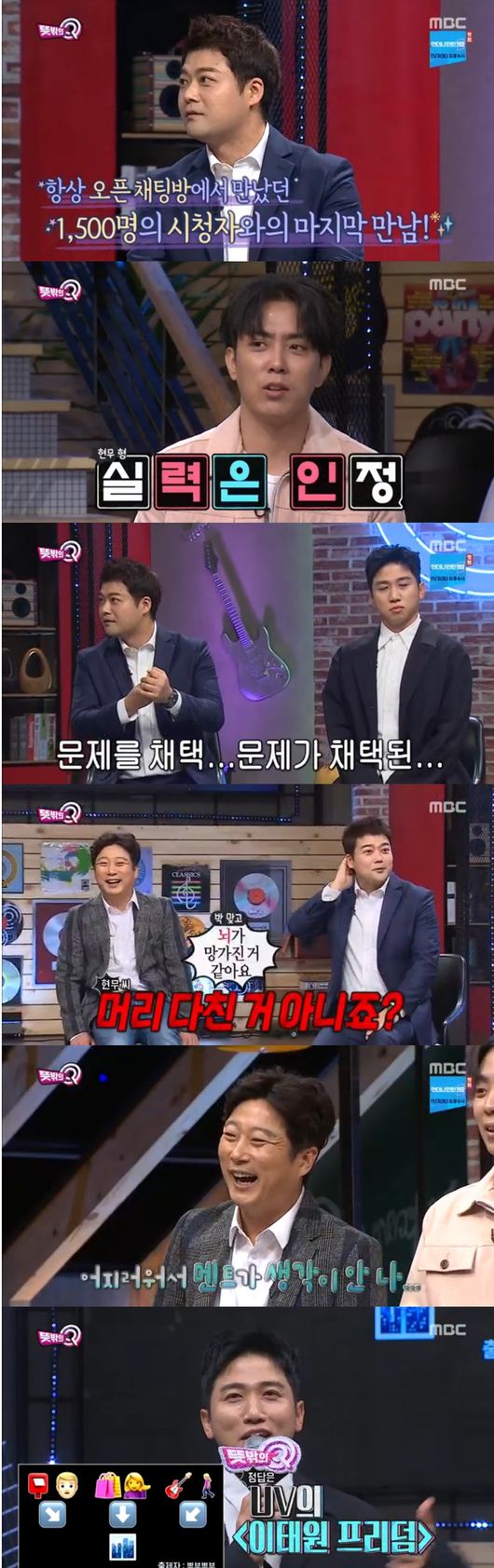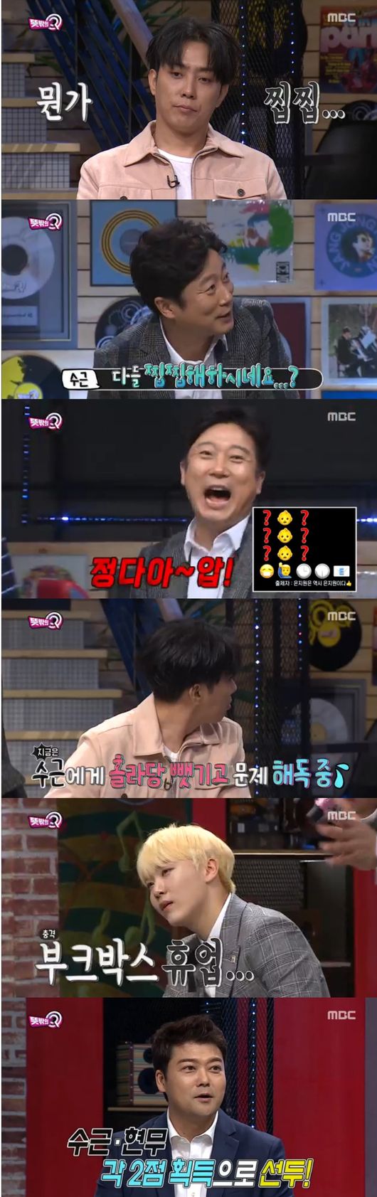 마지막 코너는 대표코너인 이모티콘 퀴즈 대결이었다. 게다가 개인전이란 말에 모두 솔깃했다. 1등은 한우세트 선물과 달리, 꼴등은 또 박을 맞아야했다. 유세윤은 자신의 노래인 '이태원 프리덤'을 시작으로 문제를 맞혔고, 승관은 "UV의 팬이된 노래"라며 함께 호응했다.이어 다음 노래는 크레용팝의 '빠빠빠'였다. 은지원은 바로 알아챘으나, 그룹명과 제목을 생각내지 못했다. 급기야 "희준아, 네 부인 이름이 뭐니?"라고 외쳐 웃음을 안겼다. 덕분에 전현무가 새치기를 하며 문제를 맞혔다.