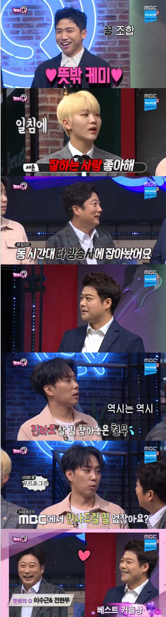 지난 27일 MBC '뜻밖의 Q'가 종영했다. 이날 MC들은 '뜻밖의Q'의 종영을 언급, MC들은 "우리끼리만 아는 비밀이지만 열심히 했다, 결과가 아쉽다"면서 말도 말고 탈이 많았던 첫 시작부터 6개월동안을 회상했다. 특히 전현무는 "스페셜MC인줄 알았는데 고정MC가 됐다"면서 "동시간대 타방송 잡았다"며 빠른 테세전환을 보여 웃음을 안겼다. 이수근은 "MBC 예능계 아픈손가락이 됐지만, 부동의 3프로 시청자들께 감사드린다"고 했고 모두 고개숙여 감사 인사를 전했다.