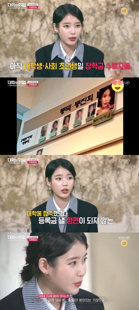 그렇게 아이유는 다양한 단체에 기부하며 자신만의 방식으로 청춘들에게 응원을 전하고 있다. 대표적인 것이 모교에 후원하는 '아이유 장학금'이다. 아이유는 "연예 활동 때문에 학교 생활을 충실히 하지 못했지만 선생님이 정말 잘해줬다. 바쁜 스케줄에 소풍을 못갔는데 나를 합성해서 소풍사진을 줬다. 그런 게 기억에 참 좋게 남았다"고 말한 뒤 "대학에 합격했으나 등록금을 내지 못하는 친구들을 위주로 5명을 지원해줬다"고 밝혔다.