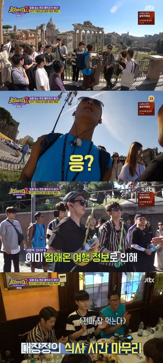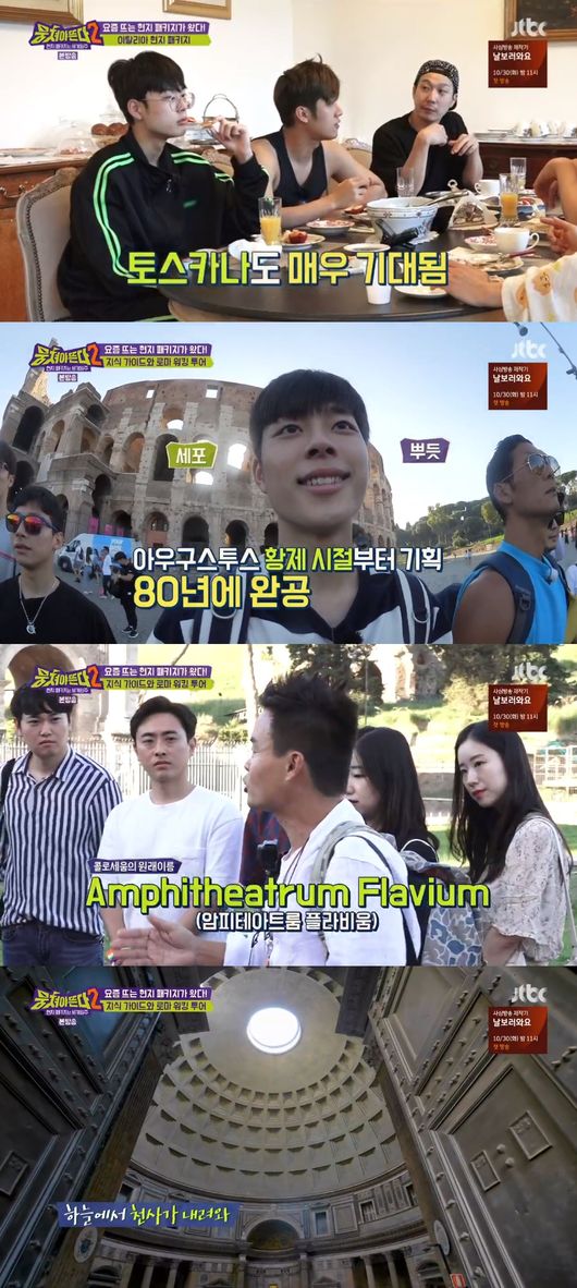 27일 오후 첫 방송된 JTBC '뭉쳐야 뜬다 시즌2'(이하 뭉뜬2)에서 이탈리아로 첫 여행을 떠나는 멤버들의 모습이 전파를 탔다. 이날 게스트 하하와 멤버들은 콜로세움과 포로 로마노 그리고 캄피돌리오 광장과 판테온 까지 가이드와 함께 직접 걸으면서 여행했다.