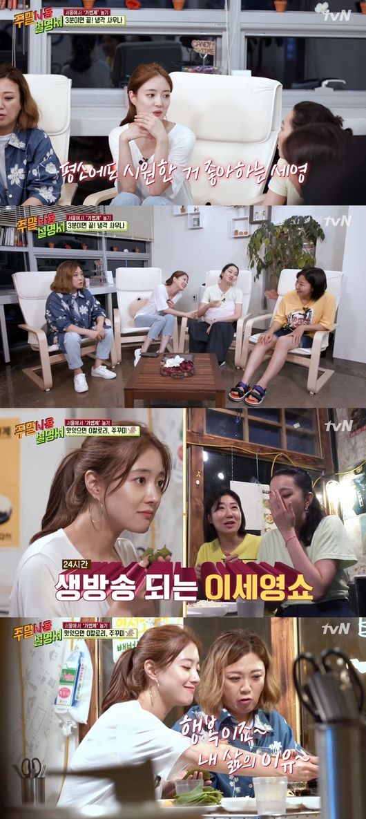 이날 방송에서는 ‘주말사용설명서’의 막내이자, 22년차 배우 이세영의 수상한 집순이 라이프가 공개된다. 자취 3년차이자 귀여운 고양이 ‘알이’의 집사인 세영은 실제 자신의 일상을 방송 최초로 공개하며 엉뚱하고 털털한 매력을 선보인다. 자칭 배달음식 마니아라는 세영의 냉장고에는 배달음식 쿠폰들이 다닥다닥 붙어있고, 냉장고 안에도 배달음식 반찬들이 가득해 이를 지켜보는 김숙, 라미란, 장윤주 등 언니들에게 짠내와 웃음을 불러 일으켰다는 후문.
