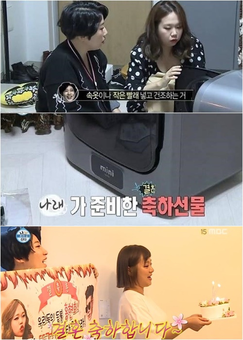 박나래는 "내 선물이다. 내가 직접 쓰고 있는데 좋더라. 나중에 아기가 태어나면 필요할 것"이라며 "속옷이나 작은 빨래 넣고 건조하는 것”이라고 미니 건조기를 설명했다.