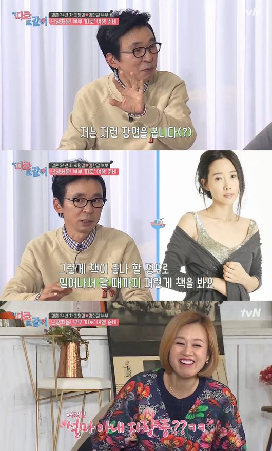 김국진은 28일 방송된 tvN '따로 또 같이' 4회에서 김한길x최명길 부부의 일상을 보며 흐뭇하게 웃었다. 최명길은 늘 남편을 챙겼고 김한길은 집에서 독서만 했다. 그의 일과는 아침부터 잘 때까지 신문 읽기와 책 보기였다.