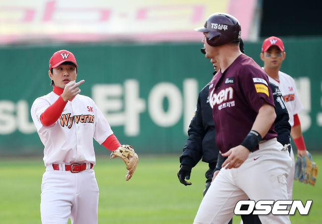 샌즈의 슬라이딩에 강승호가 넘어지며 다칠 뻔했다. 다행히 큰 부상으로 이어지진 않았지만 위험한 플레이. 그러자 SK 선수들이 발끈했다. 특히 강승호와 키스톤콤비를 이루고 있는 유격수 김성현이 샌즈를 향해 중지를 들어올리며 손가락 욕을 했다.