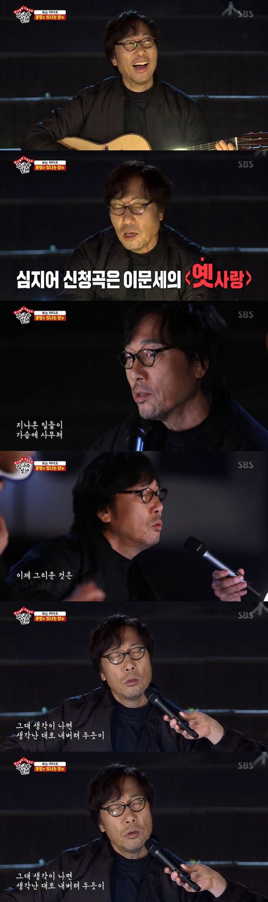 이문세는 ‘옛사랑’을 신청한 육성재에게 라이브 음악을 들려줬다. 기타를 연주하는 그의 무대는 한마디로 감동 그 자체. 실제 콘서트와 같은 노래가 이어졌다. 노래를 감상한 이승기는 “이 자리에서 못 일어나겠다”는 감상평을 남겼다. 이어 양세형은 “두 가지의 이문세 사부님을 봤다. 사부님의 이중생활을 느꼈다”고 말했다.