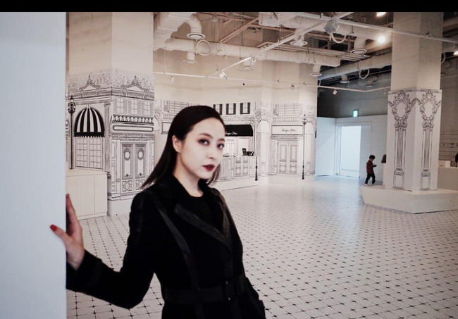 사진 속 심은진은 전시회장에서 멋지게 포즈를 취하며 카메라를 보고 있다. 블랙 의상에 새하얀 얼굴, 버건디 메이크업으로 마치 뱀파이어를 연상케 한다.