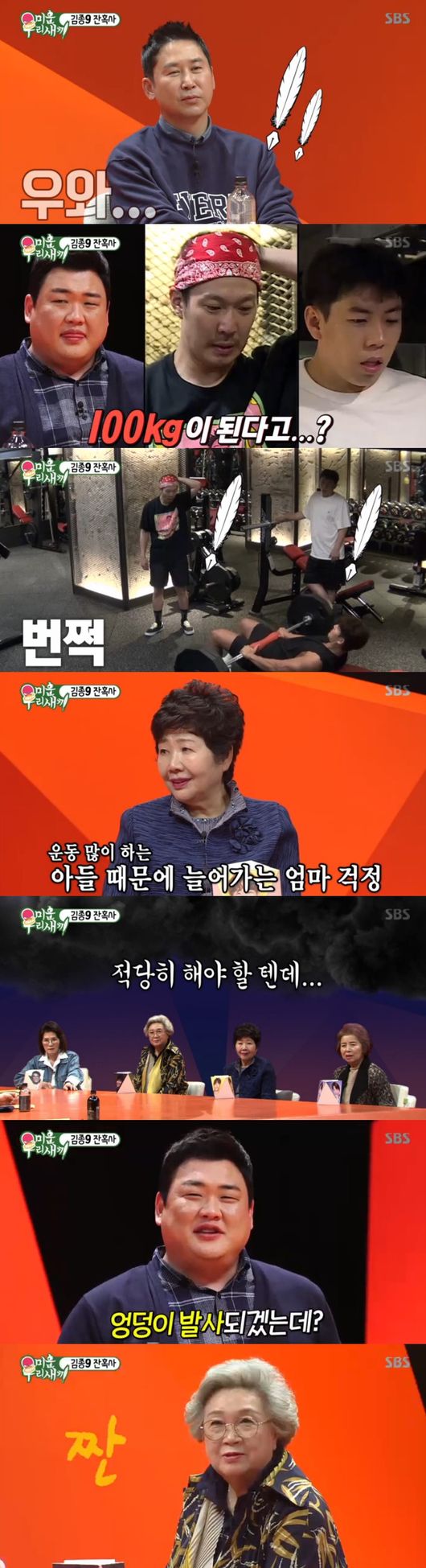 쭉쭉 갈라지는 김종국의 근육을 보고 모두 입을 다물지 못했다. 하하와 양세찬도 남자의 자존심이 걸린 듯 운동에 동참, 김종국은 100kg까지 도전하며 이후에도 네버엔딩 운동삼매경에 빠졌다. 母는 운동많이 하는 아들 걱정 "또 탈장될라 겁난다, 적당히 해야할텐데, 쟤 진짜 큰일 나겠다"며 시선을 떼지 못했다.