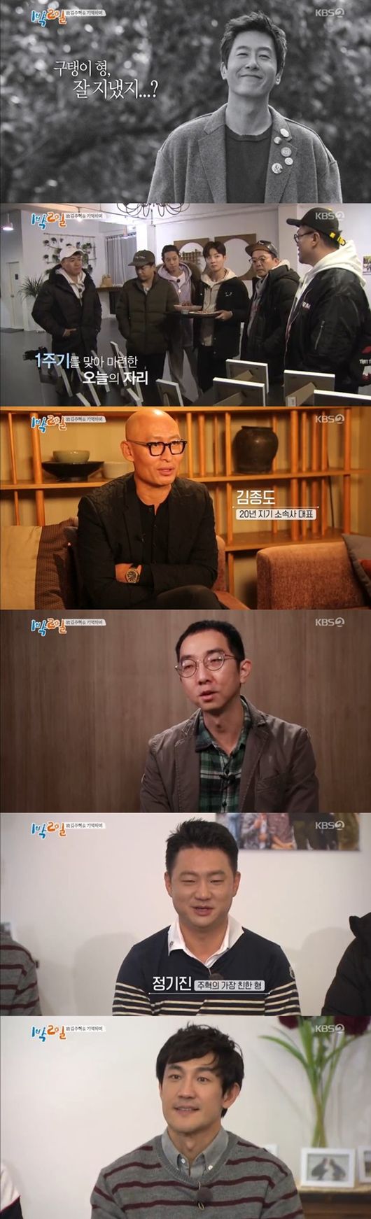 멤버들은 故김주혁의 사진들을 보며 그가 간지 1년째가 됐음을 실감했다. 김주혁의 1주기 추모 특집을 위해 그의 절친한 형이자, 김주혁으로 인해 '1박2일' 멤버들과도 인연을 맺은 정기진, 그리고 김주혁의 친한 동네 친구인 배우 한정수가 함께 자리했다.