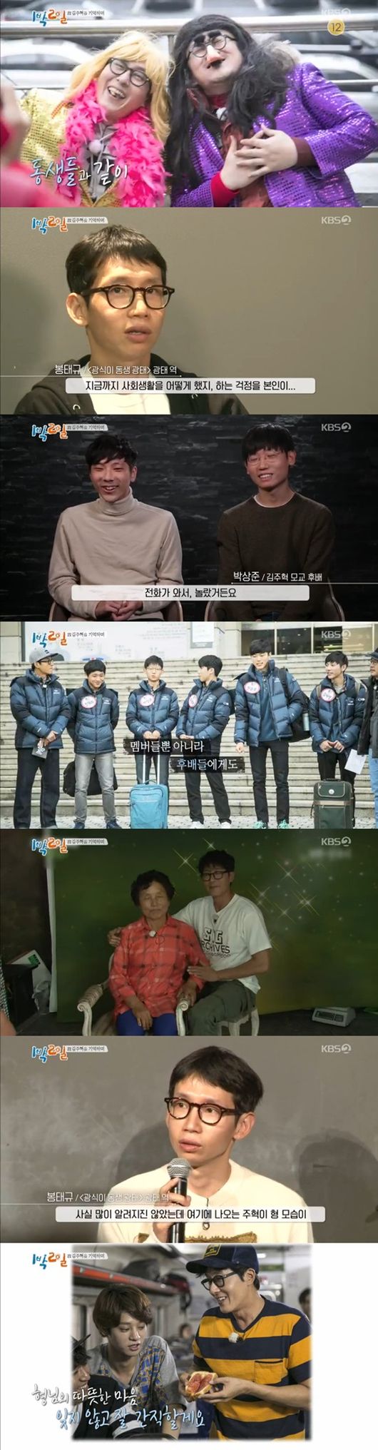 '광식이 동생 광태'에서 김주혁을 형제로 만났던 봉태규도 김주혁에 대한 추억이 남달랐다. 봉태규는 "(김주혁은)진짜 형 같았다. 촬영하는 내내 진짜 형 같았다"고 회상했다. 그는 "멤버들을 좋아하는 게 느껴졌다. 너무 착하다고 계속 얘기했다. '이렇게 착한데도 어떻게 사회생활을 했지?'라는 말을 본인이 해서 웃겼다. 정말 동생들을 좋아했다"며 '1박2일'을 특히 좋아했던 故김주혁을 떠올렸다. 또한 봉태규는 "형덕분에 좋은 작품 용기 있게 할 수 있었고, 잘 할 수 있었던 것 같다. 기회 되면 형 꿈에 한 번 나와줘요"라고 애틋한 마지막 말을 남겨 보는 이를 울컥하게 했다.