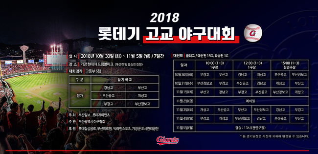롯데 자이언츠는 10월 30일부터 11월 5일까지 기장-현대차 드림볼파크에서 2018 롯데기 고교 야구대회를 개최한다.