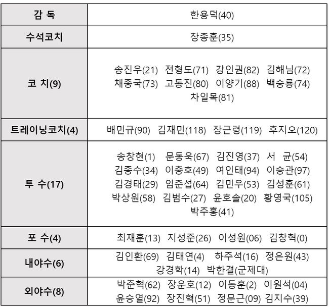 이번 마무리캠프 규모는 한용덕 감독을 비롯한 코칭스태프 11명, 선수 35명, 트레이닝 코치 4명 등 총 50명 인원으로 구성됐다. 주전급 선수로는 포수 최재훈, 내야수 하주석 강경학 정은원, 투수 박상원 김민우 김범수가 포함됐다.