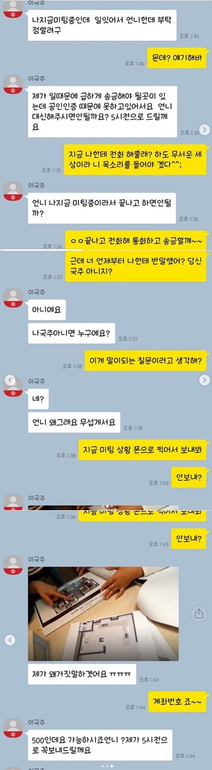이국주는 경고글과 함께 SNS로 자신을 사칭한 누군가가 지인들에 돈을 빌리려 접근하는 대화 내용을 고스란히 공개하기도 했다. 공개된 문자에는 "일 때문에 급하게 송금해야 될 곳이 있는데 공인인증 때문에 못하고 있어서요. 언니 대신 해주시면 안될까요? 5시 전으로 드릴게요" 등 이국주 지인들에게 돈을 빌리려 하는 해킹 가해자의 모습이 담겨 있다.